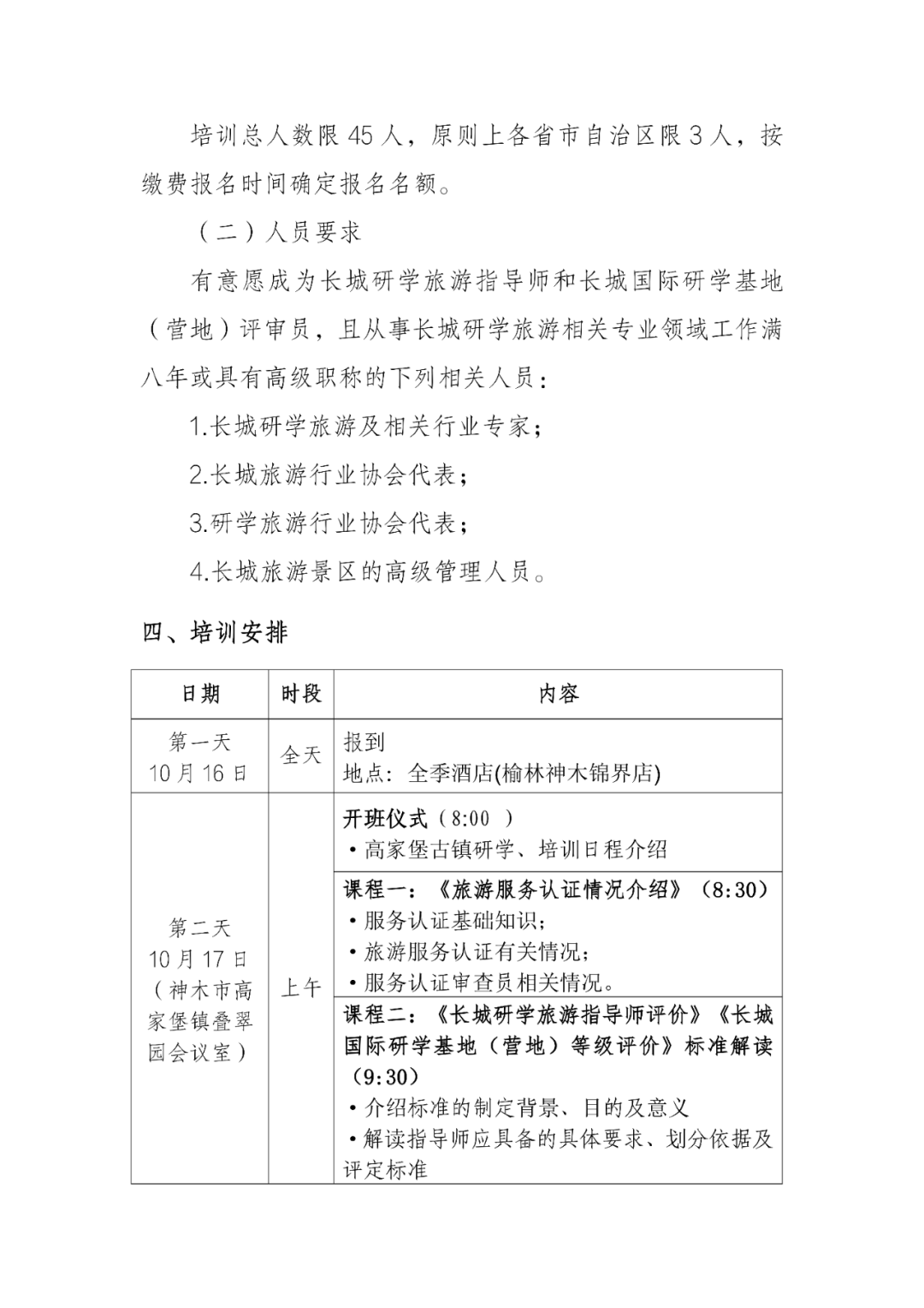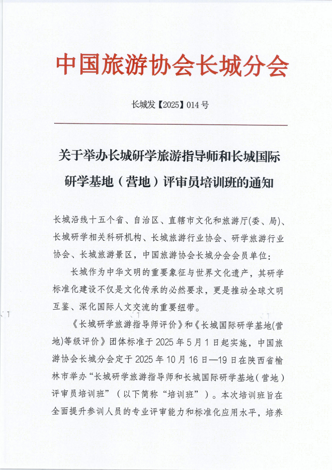 《长城研学旅游指导师评价》和《长城国际研学基地(营地)等级评价》团体标准于2025年5月1日实施,中国旅游协会长城分会定于2025年1016日—19日在陕西省榆林市举办“长城研学旅游指导师和长城国际研学基地(营地)评审员培训班”(以下简称“培训班”)本次培训班旨在全面提升参训人员的专业评审能力和标准化应用水平,培养一支精通标准、专业权威的评审人才队伍,为服务认证审查员储备人才,夯实行业可持续发展基础,为长城研学旅游指导师考核和长城国际研学基地(营地)评定和认证工作提供支持。通过“培训评定/认证-激励”管理实践,形成以标准引领发展、以评定和认证促进提升,助力长城研学旅游焕发新活力,推动文化、教育与旅游深度融合。具体通知及相关附件如下: